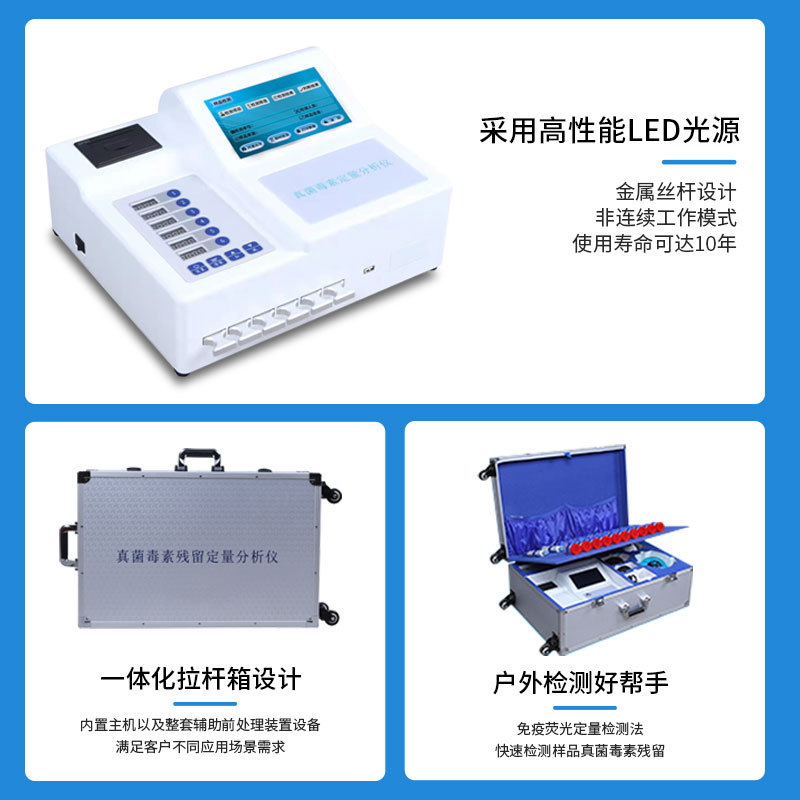 深芬儀器CSY-YG701真菌毒素快速測(cè)定儀能夠快速定量檢測(cè)糧食、飼料、谷物、食用油、調(diào)味品等食品中T2毒素、嘔吐毒素、赭曲霉毒素、伏馬毒素、玉米赤霉烯酮,適用于糧油監(jiān)測(cè)中心、糧油飼料生產(chǎn)加工、食品加工貿(mào)易、畜禽養(yǎng)殖戶自查、質(zhì)監(jiān)部門用于市場(chǎng)快速篩查等,能夠快速準(zhǔn)確定量檢測(cè)出食品中的真菌毒素含量,杜絕真菌毒素超標(biāo)食物流入市場(chǎng)。